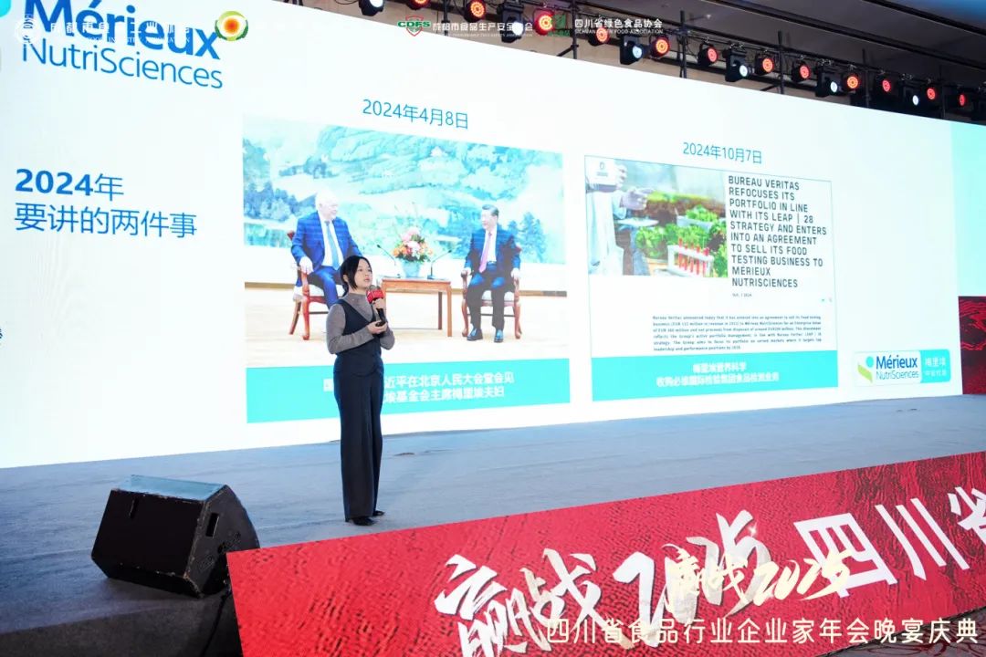 ? 12月24日,梅里埃中安檢測應邀參加了在成都非遺博覽園緹沃麗酒店舉行的“贏戰2025”四川省食品行業企業家年會。作為此次盛會的支持單位之一,梅里埃營養科學中國區銷售市場部總監龔玉莉女士出席年會并發表了講話。