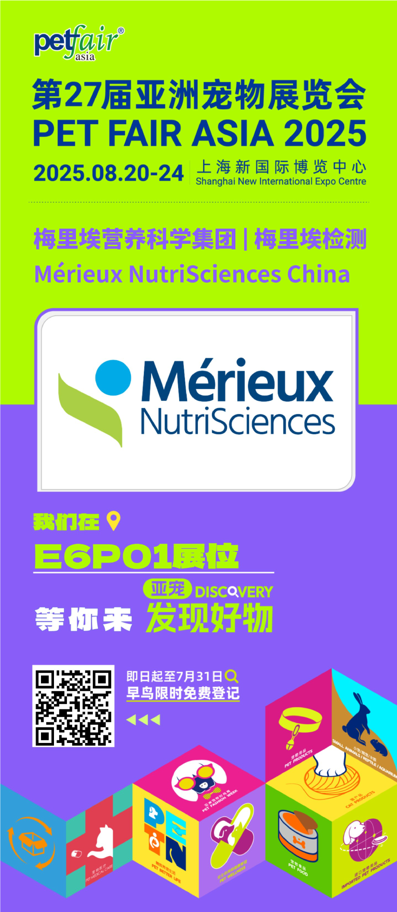 此次參展亞寵展,為了更好地向客戶提供咨詢服務,梅里埃營養科學(中國)將安排寵物食品技術專家出席展會,現場為大家答疑解惑。屆時,歡迎各位嘉賓蒞臨梅里埃營養科學(中國)展位參觀交流!亞寵展E6P01,期待與您相見!